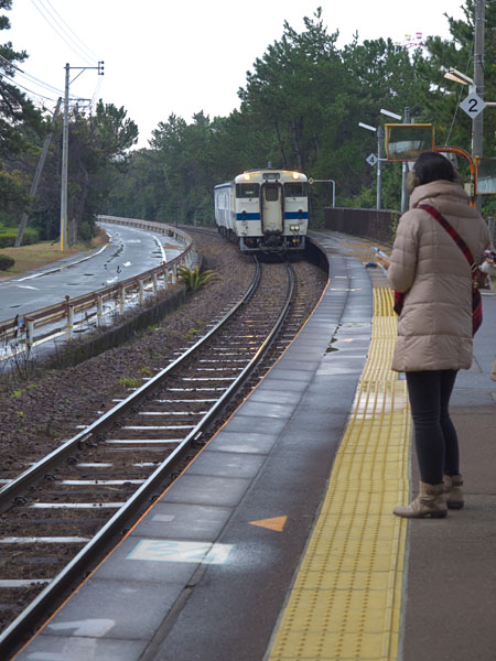 駅に着いて切符を買い、時刻表を見たところ、列車が来るまで20分も待たねばならないようだ。普通ならば20分程度は何とも無いが、寒いので本当に身に堪える。待合室にいたのでまだマシだったかも知れないが、それでも寒さは厳しい。こんなところを「南国」と言うヤツがいるのだから面白い話だ。