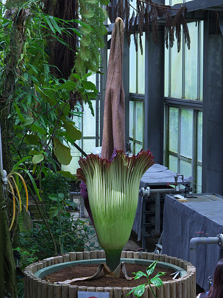 だが撮影位置が決まっても、ショクダイオオコンニャクを多くのギャラリーが取り囲むので、なかなか全体が写せない。だから下のような写真を撮るには、まさに開館直後のわずかな間か、粘りに粘って奇跡の一瞬の空白を狙うしか無い。